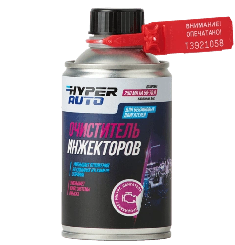«Очиститель инжекторов Hyper Auto» объёмом 250 мл предназначен для удаления отложений и нагара в инжекторах двигателя и топливопроводящих клапанах.